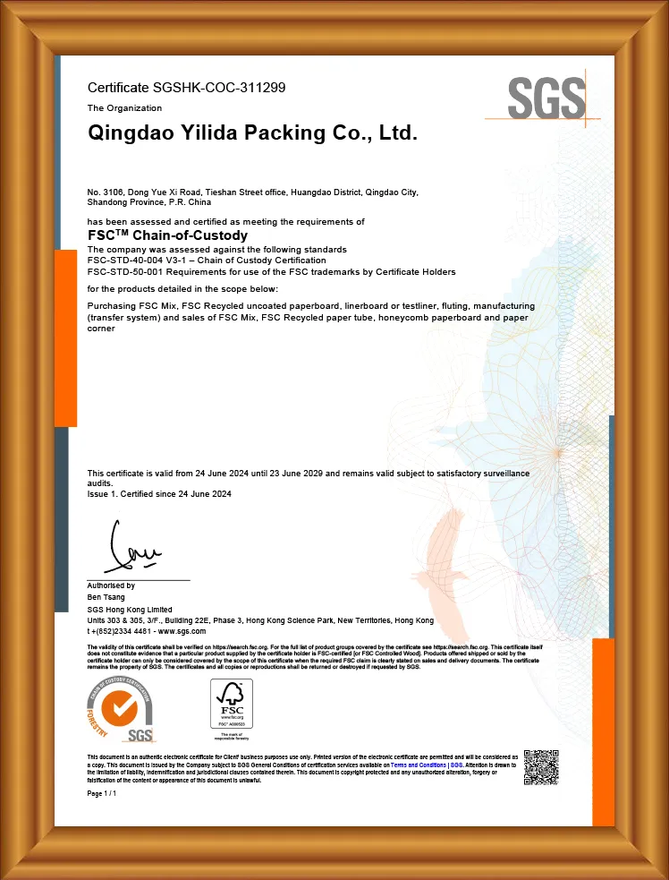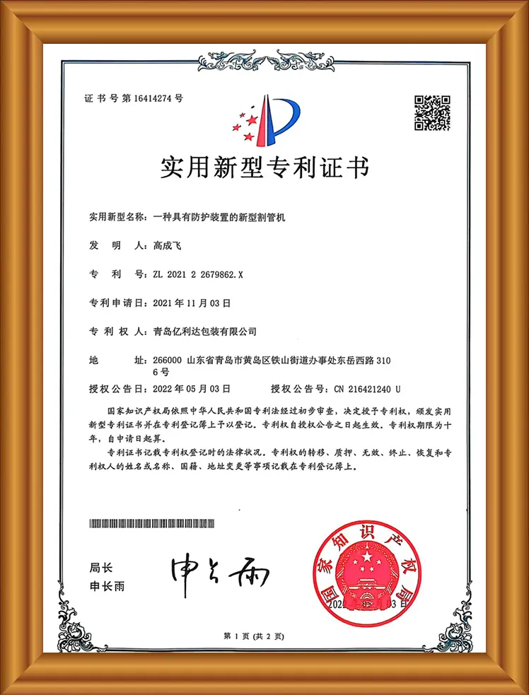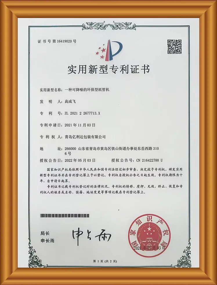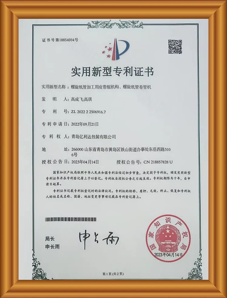 Vores produkter er FSC-certificerede, ISO9001-certificerede, har syv patenter, herunder en praktisk U-formet papirrørsmaskine, et specialiseret og innovativt Small og Mellem-Sized Enterprise-certifikat, Puni-testning og et kvalitetsleverandørcertifikat.